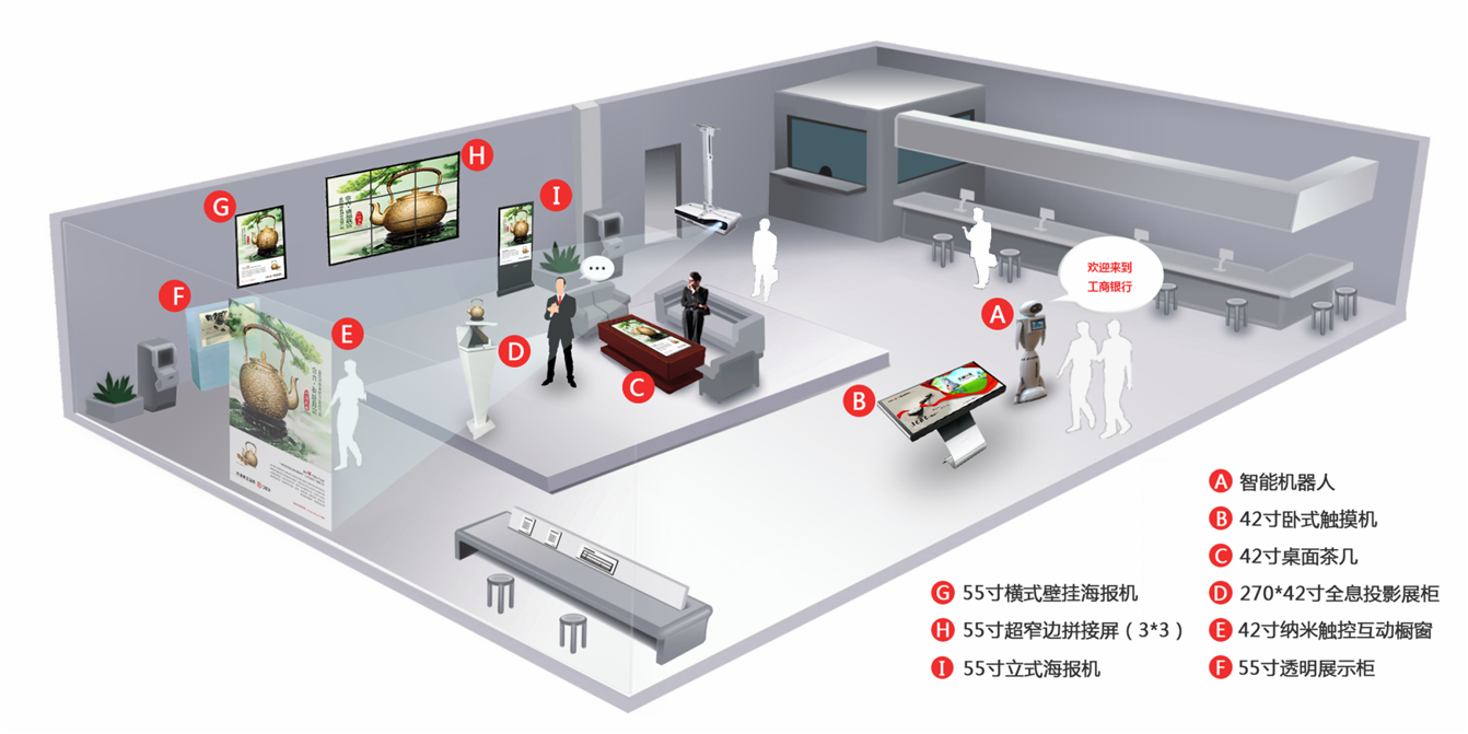 將網點內的各種設備進行整合,為客戶提供一整套智能化服務,打造全功能、全智能元素的建設銀行“智能銀行”網點。智慧銀行建設主要包括智能預處理、智能排隊、智能業務引導、互動桌面、體感互動櫥窗、同屏拼接與綜合信息發送管理平臺。