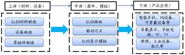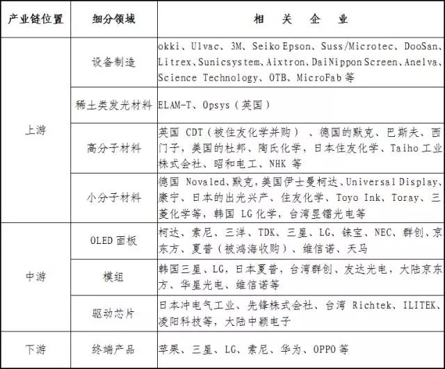 導讀: 目前,OLED產業呈現上游原材料和設備被日韓企業壟斷,中游被多巨頭把控市場,下游終端產品競爭激烈的格局