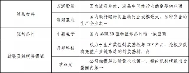 國內上游原材料廠商均處于OLED發光材料的上游,主要供應 OLED材料的中間體和單體粗品。在中游,中穎電子的AMOLED屏驅動芯片研發投入已有多年,在國內已屬技術領先,是國內唯一量產過 AMOLED 屏驅動芯片的廠商。下游顯示屏企業主要有京東方、天馬、維信諾、華星光電、和輝光電等。