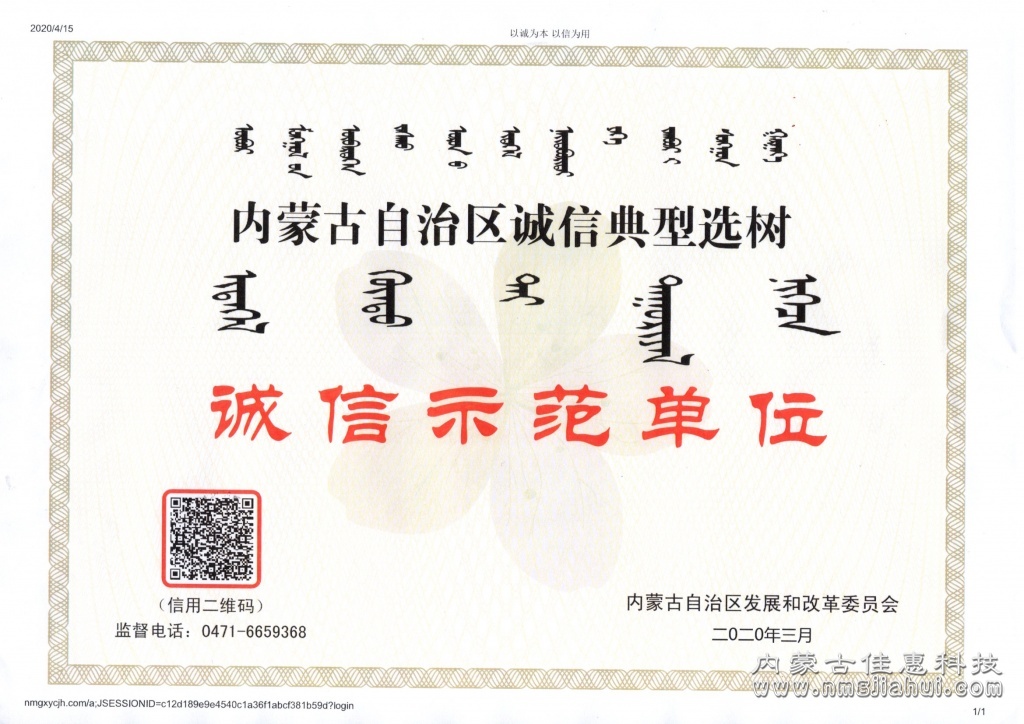 近日,根據內蒙古自治區、呼和浩特市兩級發改委關于誠信典型選樹的工作安排,呼和浩特經濟技術開發區發展改革和經濟促進局組織轄區內各類企業在“信用中國(內蒙古呼和浩特)網站”和“內蒙古信用促進網”申報誠信示范典型材料。經自治區信用主管部門嚴格的初審、復審,內蒙古佳惠科技有限公司被選樹為2020年度誠信示范單位。